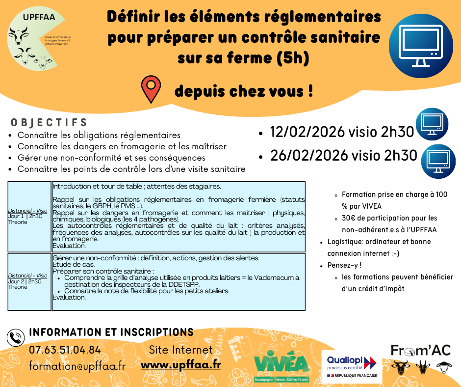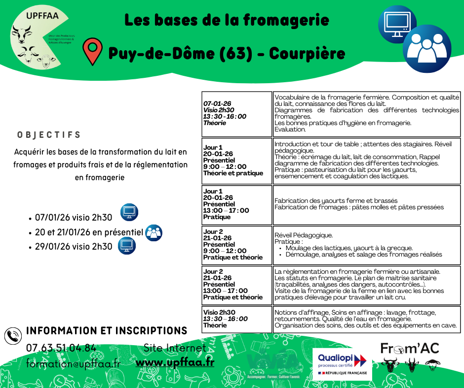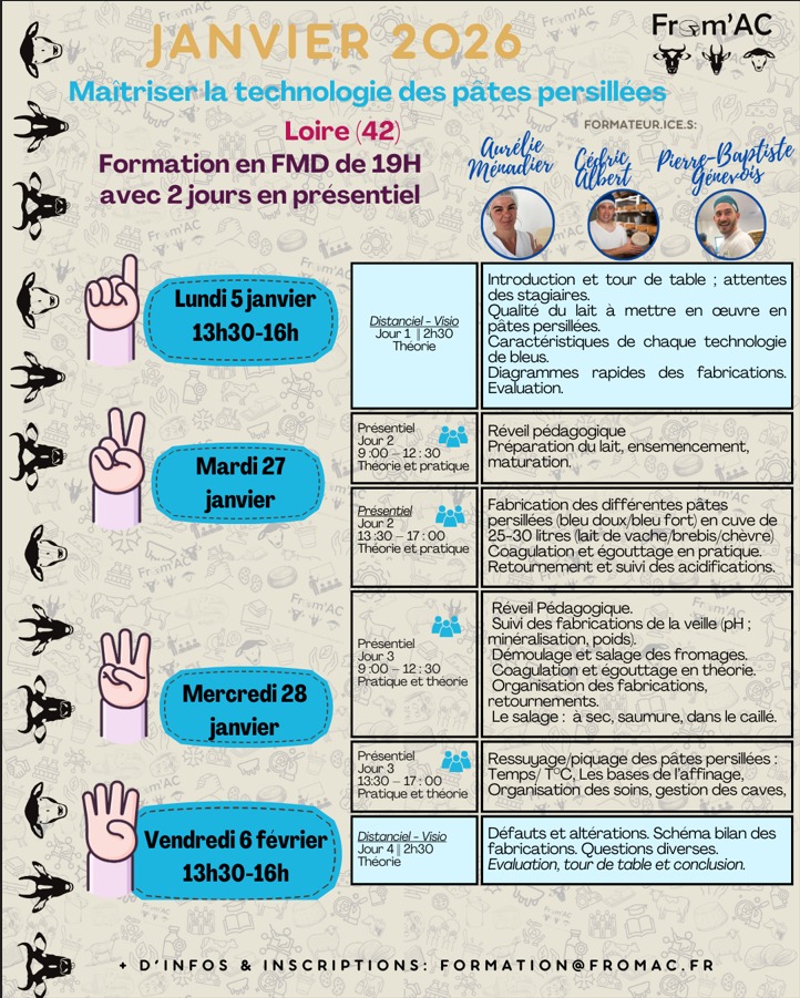 "Maîtriser les bases de la fromagerie fermière" : acquérir les bases de la transformation du lait en fromages et produits frais, avancer dans son projet, choisir sa production et se poser les bonnes questions (adaptée aux salarié(e)s) - 2*2h30 en visio + 2 jours de pratique - Formatrice : Aurélie Ménadier From'AC - 7 janvier en visio, 20 et 21 janvier 2026 en présentiel à la Ferme de la Terrasse à Courpière (63 Puy-de-Dôme), 29 janvier en visio